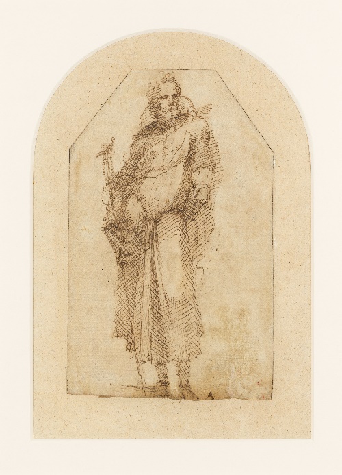 Domenico Beccafumi (vers 1486-1551) Saint Antoine – Dessin double face Plume et lavis de bistre Monogrammé en bas au milieu Au verso, Femmes agenouillées 20,5 x 13 cm
