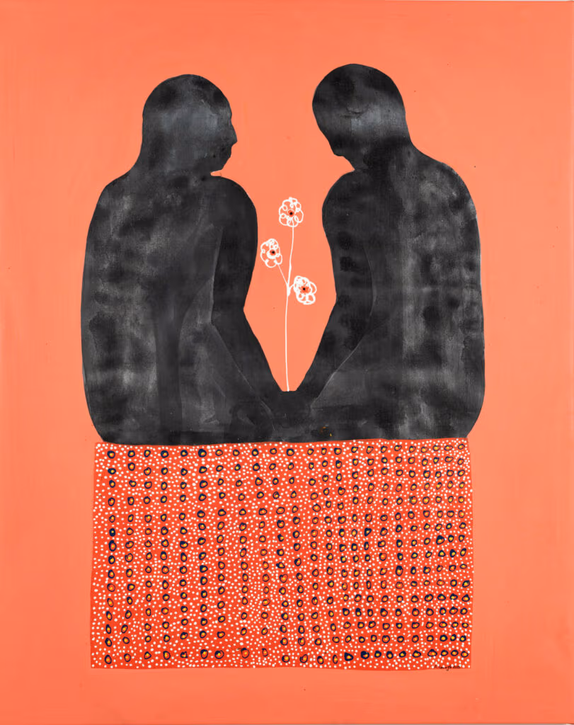 Né en 1977 à Ségou au Mali, Amadou Sanogo est Sénoufo mais grandit dans la culture et la philosophie Bambara. Il se nourrit de cette tradition et l’intègre dans ses peintures. Souvent constituée d’un personnage central se détachant sur un fond monochrome, son œuvre singulière explore des questionnements universels. Selon Simon Njami : « Chaque œuvre correspond à une sorte de conte à travers lequel, d’une manière métaphorique, l’artiste commente l’état du monde. Et c’est peut-être dans cette forme de narration que ce que l’on pourra nommer, faute de mieux, son africanité, se révèle. Toujours des fonds unis sur lesquels viennent se superposer les personnages. Dans un système de mise en abyme, il y a toujours un cadre dans le cadre, à l’image de ces dé cors qu’utilisaient les photographes de studio. Le cadrage précise l’action, la désigne à nos yeux. La toile est un écran et l’action un film projeté. Les couleurs ne sont jamais violentes mais contiennent toutes la douceur du pastel. Les per sonnages sont des silhouettes interchangeables. C’est une figuration qui laisse les personnages dans un anonymat volontaire. Ils pourraient être n’importe qui. Des Africains, des Européens, des Asiatiques. Et même si les proverbes, réels ou inventés pour la circonstance ont des accents identifiables, leur sens, en revanche, trouve un écho dans l’humanité tout entière ». (In Une parole, un engagement, catalogue d’exposition Amadou Sanogo, Yebali Lakali, Galerie MA GNIN-A, septembre 2023)