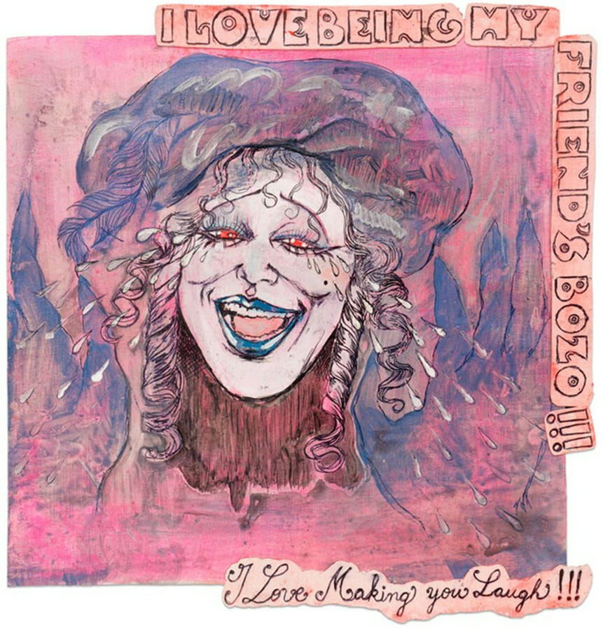 I love being my friend’s Bozo !!!, 2022 acrylique, encre et collage sur carton 30,5 x 33 cm