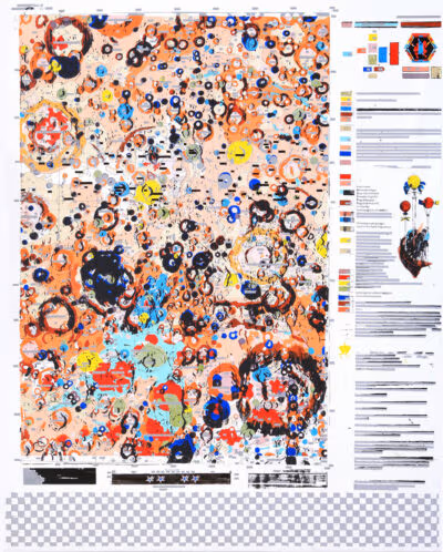 Pourtant, sur ces compositions au format large et derrière l’aspect déconcertant des formes qui se chevauchent, des larges traits de peinture, des signes qui clignotent, une volonté encyclopédique se déploie. Critiquer, mais aussi construire, dans un mouvement dialectique qui sous-tend ce travail en profondeur. Si chacune des compositions de Nicolas Pol est surinvestie d’éléments et de techniques variés, voire disparates, c’est qu’un sens global s’y écrit en permanence. Dans la grande tradition de la Renaissance, le peintre est aussi le savant. Références érudites, dessins techniques, planches d’encyclopédie, cartes, mais aussi vues d’intérieurs qui pourraient rappeler les salons du Nautilus : les compositions les agencent en toile d’araignée, réseaux complexes ou strates de sens.