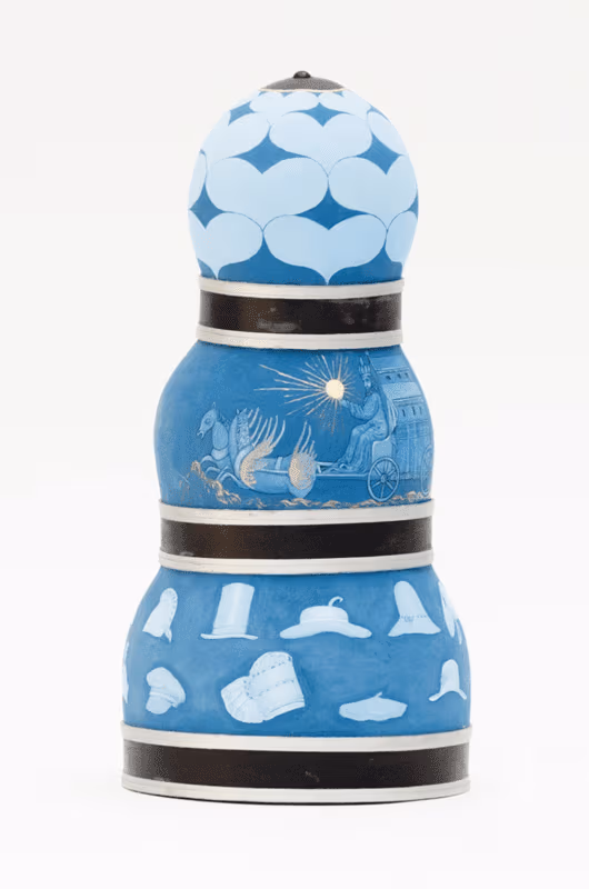Victor Ruiz-Huidobro réalise des tiares et mitres, qui peintes et sculptées, deviennent les couronnes d’un monde à l’envers, où l’ordre, le sens et la raison seraient mis à mal au profit de l’imagination et du jeu. Ces coiffes, éléments principaux des costumes liturgiques, deviennent ici les supports d’une iconographie et de narrations joyeuses et référencées. La précision du travail d’ornementation place ces objets dans un entre deux formel et usuel absurde : à la fois œuvre à contempler, ils sont également voués à être portés, ils possèdent la vivacité de jeux d’enfants ainsi que la rigueur de pièces ethnographiques. Les tiares et les mitres de Victor Ruiz-Huidobro deviennent ainsi sacrées uniquement pour celles et ceux qui savent se « prendre aux jeux ».